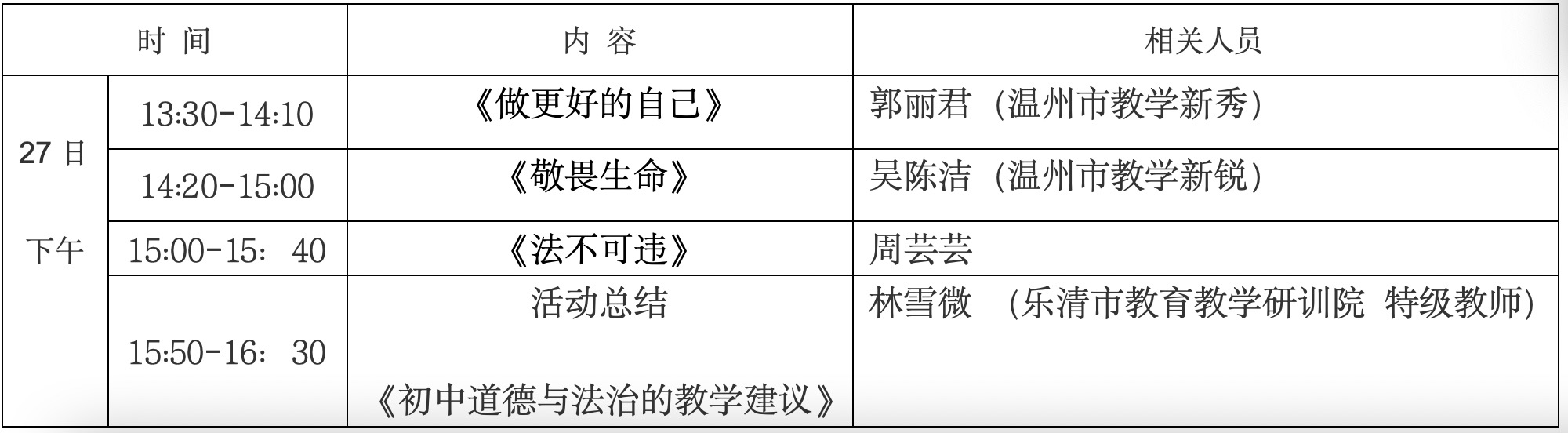 为了加强初中道德与法治学科教师对新教材的理解,更好地落实好新课标、用好新教材、追求新课堂,探讨“三新”背景下的课堂教学新思路。经研究,决定开展“新课标、新教材、新课堂”活动暨温州林雪微名师工作室第十七次活动。现将有关事宜通知如下: