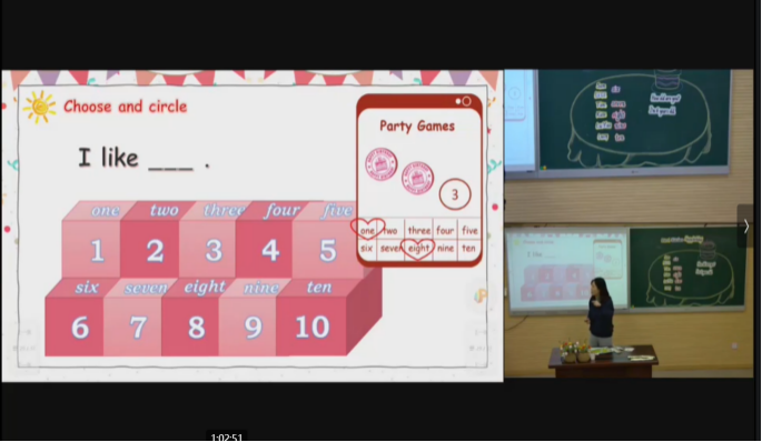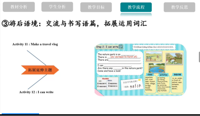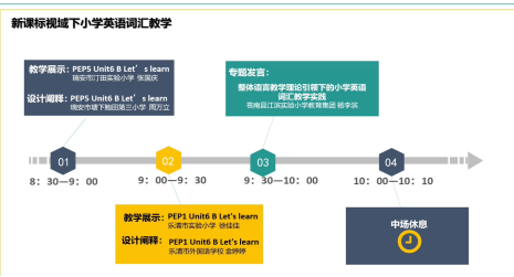 第一节课PEP5 Unit6 B Let’s learn,由瑞安市汀田实验小学张国庆老师执教,瑞安市塘下鲍田第三小学周万立老师进行设计阐释。本课创设了游览自然公园的语境。通过游前、游中、游后三个不同的情境,巧用多模态语篇,复现旧知、操练和拓展新知。第二节课PEP1 Unit6 B Let's learn,由乐清市实验小学徐佳佳老师执教,乐清市外国语学校金婷婷老师进行设计阐释。本课围绕生日语境,联系生活经验,拓展和内化了知识语言。之后,由苍南县江滨实验小学教育集团杨李滨老师做《整体语言教学理论引领下的小学英语词汇教学实践》的专题发言。李老师分享了观点:通过融合词汇于多模态语篇中,并依托语篇带动学生学习词汇,提升学生听、说、读、看、写等语言技能,发展综合语用。