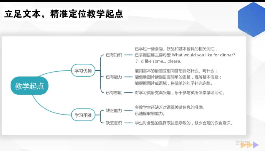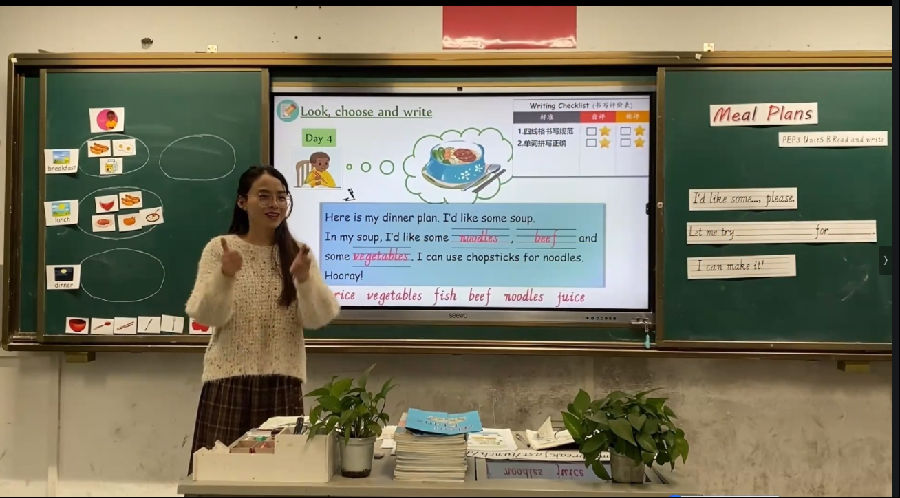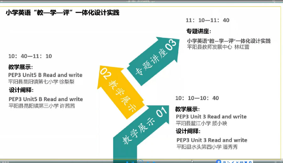 第二节课PEP3 Unit5 B Read and write,由平阳县昆阳镇第七小学徐梨梨执教,平阳县昆阳镇第三小学许茜茜老师做设计阐释。本课学生通过制作Meal plans完成学习目标。老师将评价活动与学习活动紧密结合,监控教与学过程,为促教、促学提供参考和依据。之后,由平阳县教师发展中心林红蕾老师做《小学英语“教—学—评”一体化设计实践 》的专题讲座。林老师通过设问引入,从教学评价的作用和原则、教—学—评一体化设计的内涵分析、教—学—评一体化的设计实践三方面,结合实例向我们阐释了教—学—评一体化设计的实施路径。
