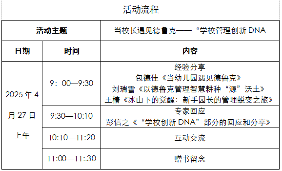 在变革与创新交织的教育新时代,学校管理者如何汲取经典智慧,激活组织生长的核心密码?当现代教育理念与德鲁克管理思想相遇,一场关于学校治理本质的探索就此展开。2025年4月27日(周日)上午9:00将举行温州市陈娴名园长工作室第12次修活动,聚焦“当校长遇见德鲁克——“学校管理创新DNA”主题。本次活动特邀德鲁克管理思想研究专家彭信之教授现场深度回应,共同探讨幼儿园治理中“真问题”的破解之道。通过案例剖析、专家对话、思维共创三重环节,助力园长学员们从管理惯性走向创新自觉,为园所可持续发展注入DNA级驱动力。