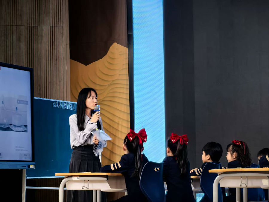 下午,泰顺的章晓凝老师与 201 班的同学们带来了一堂充满童趣的《我们周围的空气》。考虑到低年级学生的认知特点,章老师设计了 “空气和水的对比” 这一核心探究任务,并巧妙地引入外星人的视角。课堂上,章老师引导学生先回顾对水的观察经验,再将这种观察方法迁移到对空气的观察中。从看得见、摸得着的水,到看不见、摸不着的空气,层次化的探究设计符合低年级学生的认知规律,有效帮助学生逐步建构起对空气的科学认知,让学生在轻松愉快的氛围中感受科学的奇妙。
